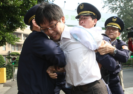 臺第三社會黨發言人剪斷官方“入聯”布條(圖)