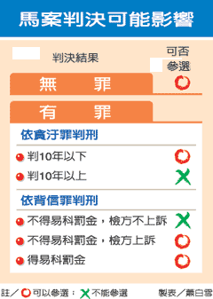 報道說,依臺“總統、副總統選舉罷免法”規定,馬英九二審若維持無罪判決,或被依貪污罪判刑十年以下,都不影響參選“總統”資格。