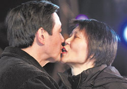 國民黨馬蕭競選總部14日晚在臺中市體育場舉辦“濃情蜜意不能沒有你”情人節音樂會,馬英九、周美青夫婦上臺與觀眾見面,主持人要現場夫妻一起玩“一起跟著做”游戲,輪到馬英九夫婦時,兩人迅速地嘴對嘴親吻一下。(臺灣中國時報圖;黃國峰攝)