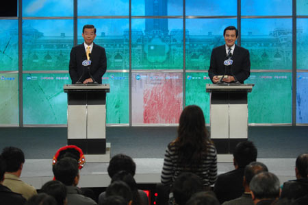 中新網2月24日電 二00八年臺灣地區領導人選舉第一場電視辯論會今天下午結束,馬英九與謝長廷在回答民眾最后一個問題時,不得不互相夸起來。