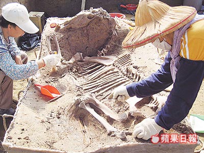 考古隊(duì)員表示,出土的馬匹遺骸,是一只側(cè)躺狀的全馬骨骸,鼻子附近有金屬扣環(huán),背有類似馬鞍的褐色粉狀物,肚子還有類植物性粉狀物,應(yīng)是馬當(dāng)時(shí)肚子里的食物。