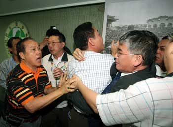 昨晚在臺北市舉辦挺扁大會的臺北市黨部主委黃慶林今天率眾到黨中央抗議,要求王拓下臺。中央黨部副秘書長洪耀福接見時開口提及“當初第一個主張開除陳水扁的就是黃慶林”時,黃慶林立刻拍桌表示不滿,立即引發(fā)拉扯沖突,場面混亂,黃慶林人馬與中央黨部人員發(fā)生扭打,最后洪耀福在黨工的保護下先行離開。