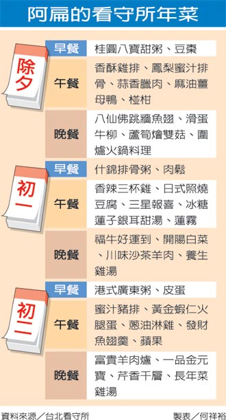 而春節(jié)即將來臨,所方已經(jīng)依往例規(guī)劃好過年菜色,除夕至初二的三天都有加菜,必須在看守所過年的阿扁,可以吃到“八仙佛跳墻魚翅”、“滑蛋牛柳”、“蘆筍燴雙菇”及“圍爐火鍋料湯”等年菜。