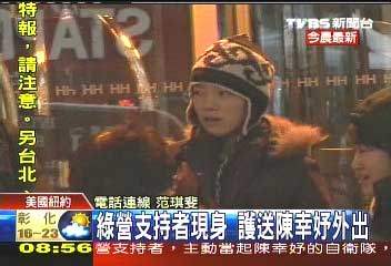 中新網(wǎng)2月6日電 據(jù)臺灣TVBS報道,人還在紐約的陳水扁女兒陳幸妤,在當?shù)貢r間早上10點半左右,前往紐約大學牙醫(yī)學系,走出飯店時,出現(xiàn)綠營支持者,主動當起陳幸妤的自衛(wèi)隊,一度跟昨天向陳幸妤嗆聲的藍營支持者,發(fā)生口角。