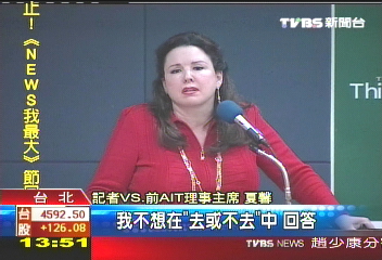 中新網(wǎng)2月13日電 據(jù)臺(tái)灣“今日新聞”報(bào)道,曾經(jīng)被陳水扁贊譽(yù)為“臺(tái)灣守護(hù)天使”的前美國(guó)在臺(tái)協(xié)會(huì)(AIT)理事主席夏馨,一向挺扁到底,但今天(13日)夏馨應(yīng)邀來(lái)臺(tái)演講,卻一反常態(tài),不但只字不提政治,當(dāng)媒體一問到“陳水扁”三個(gè)字,夏馨竟然當(dāng)場(chǎng)變臉!