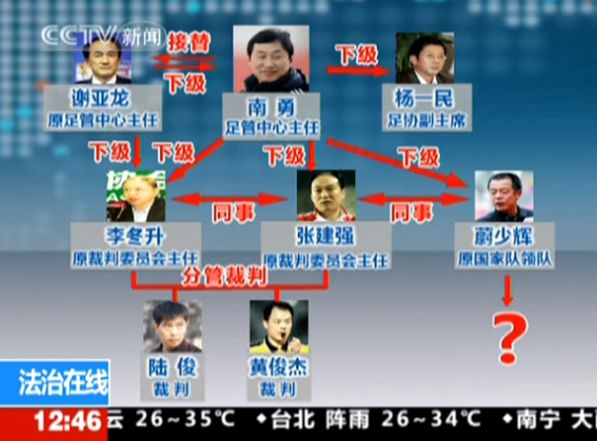 中新網(wǎng)9月13日電 自上周末公安部證實(shí)前謝亞龍、李冬升和蔚少輝已被立案偵查之后,中國足協(xié)已有多人被抓。中央電視臺在今天的新聞節(jié)目中,解析了“足協(xié)高官涉案”的“關(guān)系網(wǎng)”。
