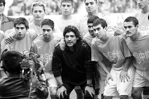 按照此次溫暖中國行的計劃,馬拉多納帶領(lǐng)的阿根廷隊將與李明領(lǐng)銜的山東國腳進(jìn)行一場義賽,所得款項捐獻(xiàn)給中國紅十字基金會,屆時老馬將會親自登場比賽。下午14時30分左右,奧體中心體育場已經(jīng)坐了一大半球迷,有人穿著阿根廷國家隊的藍(lán)白球衣,有人舉著紀(jì)念圍巾。球場上兩支隊伍在熱身,并不見主角馬拉多納的影子,工作人員稱他還在飛機(jī)上。
