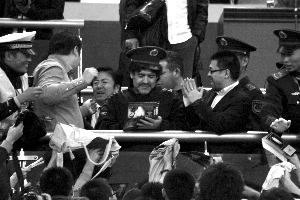 簽名、繞場一周、顛球、演講……馬拉多納用盡了招數(shù)也沒能取悅昨日來濟(jì)南奧體中心觀看比賽的球迷,因為他們都是沖著“老馬保證登場不少于20分鐘”這個噱頭而來,但是球王并未如約展示球技。