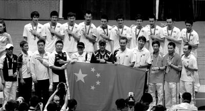 艱難戰(zhàn)勝韓國隊,賽后李永波帶領(lǐng)男隊打出特有的慶祝手勢。周民 攝