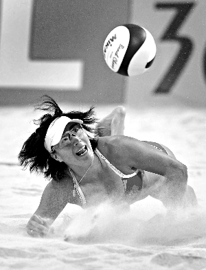 亞運會沙排半決賽,中國選手張希飛身救球,她和搭檔薛晨晉級決賽。新華社發
