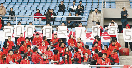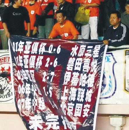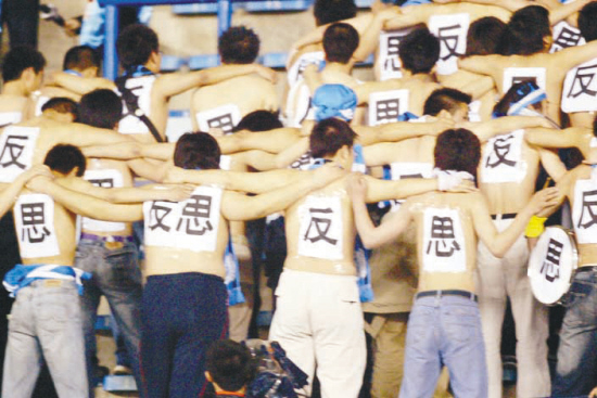 大連不愧為中國的足球城。2006年5月21日,一群大連球迷在看臺上光起膀子,背后貼滿了“反思”,這是中國球迷最真切的想法?上В袊闱驔]有停止過反思,只是很少采取行動。