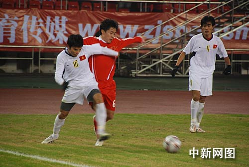 不過國足并沒有被突如其來的丟球打亂陣腳,第20分鐘憑借姜寧的妙傳造成郜林單刀,這次他把握住了機會低射命中,將比分改寫為2-1。7分鐘后,中國隊獲得角球機會,吳昊爭頂漏過皮球,杜威迎球怒射破門,將比分擴大為3-1。第37分鐘,國足發動攻勢被越南隊后衛破壞,姜寧在禁區前沿拿球后大力抽射,皮球洞穿了客隊大門。上半場比賽結束時,國足就以4-1大比分領先。
