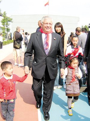 昨天下午,大衛(wèi)·斯特恩率領(lǐng)騎士眾星出現(xiàn)在上海閔行區(qū)的魯冰花農(nóng)民工小學(xué),NBA為這所學(xué)校捐建了一個(gè)籃球場(chǎng)、一個(gè)電腦室和一個(gè)圖書室,大衛(wèi)·斯特恩親自為這些康樂中心剪彩。在兩個(gè)小學(xué)生的牽引下,戴著紅領(lǐng)巾的大衛(wèi)·斯特恩滿面春風(fēng),看到孩子們?cè)缇妥诨@球場(chǎng)上等他到來,斯特恩高興地向孩子們揮手致意。