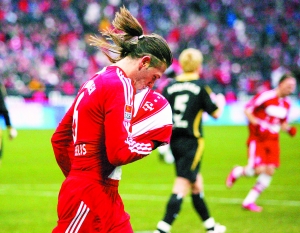 最先掀起“愛情風(fēng)暴”的是當(dāng)下狀態(tài)大勇的法國(guó)球星里貝里,他本場(chǎng)特意穿上粉紅球鞋戴上紅色手套,活脫脫一個(gè)紅色小精靈。第29分鐘他的任意球直接破門,為球隊(duì)很快扳平了比分。這也是里貝里連續(xù)第6場(chǎng)聯(lián)賽進(jìn)球,激動(dòng)的他在進(jìn)球后特別親吻了寫有妻子瓦希芭(Wahiba)名字的左手腕繃帶。半場(chǎng)結(jié)束前,中衛(wèi)德米凱利斯收獲進(jìn)球。阿根廷人進(jìn)球后令人意外地?fù)炱鹎驅(qū)⑺M(jìn)球衣里,做出孕婦的姿勢(shì)。原來這一幕是獻(xiàn)給他已經(jīng)懷孕的女友伊萬格利娜的。下半場(chǎng),拜仁的進(jìn)球風(fēng)暴并未停歇,而表達(dá)愛意的慶祝動(dòng)作也似乎可以傳染?寺鍧蓪⒗镓惱锏膫髦星蝽斎牒螅斐鋈种,指代妻子希爾維婭和雙胞胎兒子。此后托尼和奧多配合后破門,意大利人也特別親吻著左手,原來大拇指上戴有未婚妻瑪塔送他的戒指。