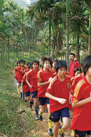 再往里走,便看見了一群十五六歲的女孩。她們穿著統一的紅色運動衣,在坑洼不平的操場上奔跑著,身旁跟隨著她們的教練肖山,剛才那個沙啞的聲音就是他喊的。“今天訓練表現最好的隊員,一會兒才有雞腿吃!”肖教練說。