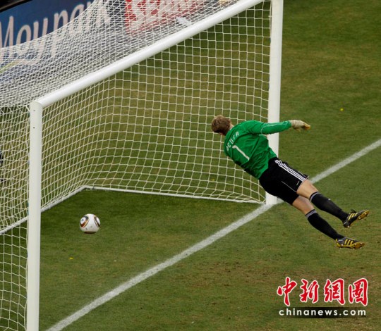 本場比賽最大的爭議出現(xiàn)在第38分鐘,蘭帕德遠(yuǎn)射后擊中德國隊的橫梁,皮球彈下后過了球門線,但又被彈到橫梁上,德國隊門將諾伊爾將球沒收。但是慢鏡頭顯示,皮球整體已經(jīng)越過了球門線達(dá)1碼左右。不過,主裁判在征求了邊裁的意見后,宣判此球無效,比賽繼續(xù)。