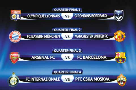 歐冠1/4決賽和半決賽對陣形勢昨晚在瑞士尼翁揭曉,上半區(qū)是拜仁慕尼黑對曼聯(lián)、里昂對波爾多,下半區(qū)是阿森納對巴塞羅那、國際米蘭對莫斯科中央陸軍,“重逢”成為本次抽簽的主題。由英超球隊包辦半決賽3個席位的乏味場面本賽季絕不會出現了,本賽季8強來自6個國家的聯(lián)賽。