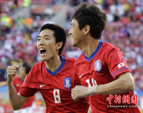 中新網6月12日電 北京時間今晚,在南非世界杯B組的一場小組賽中,韓國隊憑借李正秀和樸智星的進球2-0完勝希臘取得開門紅。這也是韓國參加世界杯以來在本土外的第二場勝利。