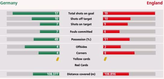 角球方面,德國隊有4個,少于英格蘭隊的6個,其中英格蘭隊利用第一次角球的機會敲開了德國隊的大門。