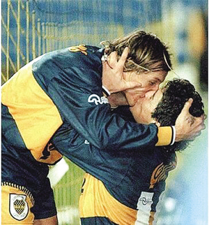 阿根廷人的豪放這一刻展現得淋漓盡致,主角是球王和風之子。當時風之子接到球王的妙傳破門得分,兩個人當場不顧全場所有觀眾和其他的隊友激吻在一起,長達6分鐘,而且還是“舌吻”!當時引起了全世界的轟動!好戲還在后頭:卡尼吉亞的老婆說:“馬拉多納是同性戀,他喜歡親吻卡尼吉亞的嘴唇。”當然老馬很生氣,但是他表示:“看在卡尼吉亞的份上就不追究了!”