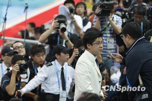 昨天東亞運(yùn)的跳水比賽,當(dāng)現(xiàn)場(chǎng)司儀介紹隊(duì)員名單時(shí),霍啟剛起身走出貴賓室,來到看臺(tái)上的貴賓席。此時(shí),記者乘機(jī)進(jìn)了貴賓席,“潛伏”在霍啟剛的后一排,與他的距離不到30厘米。