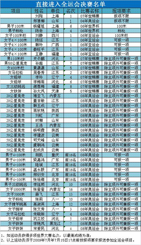 其中參加重大比賽(奧運會、世錦賽、世界杯賽、亞運會、黃金聯賽、其它洲際賽事等)的運動員,沒有獲得名次積分的,其成績按全國錦標賽的名次積分。取得名次的將按評分表規定積分。代表中國隊參加鄰國邀請賽、訪問賽、對抗賽的運動員成績和名次按國內大獎賽的標準積分。(保羅)