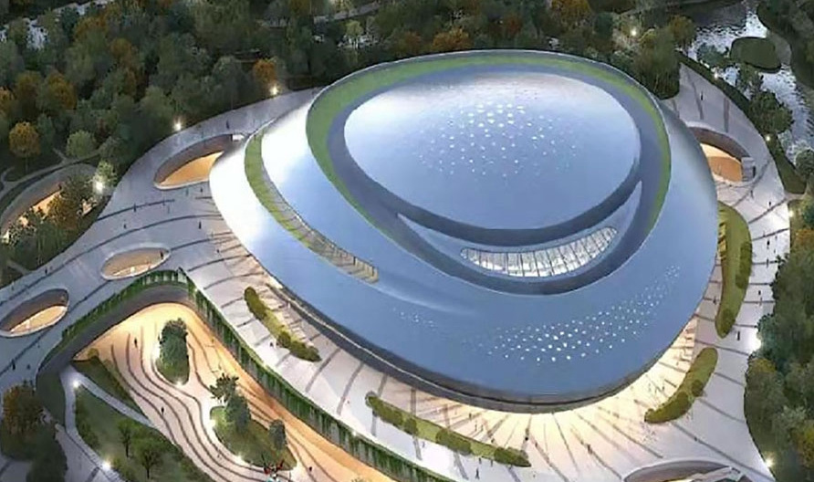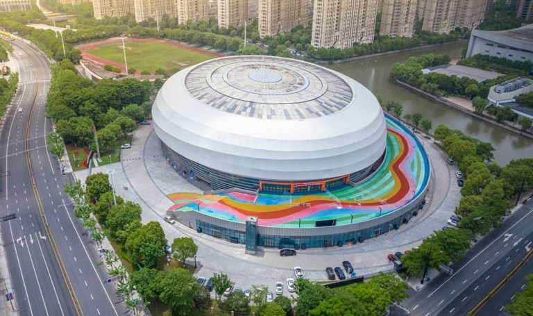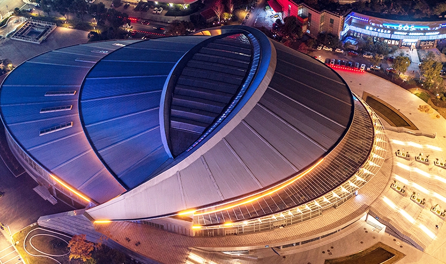 紹興奧體中心體育館為亞運(yùn)會(huì)籃球項(xiàng)目比賽場(chǎng)館,位于紹興市越城區(qū),在亞運(yùn)村東南方向且相距約38.8公里。總建筑面積72010平方米,觀眾席位數(shù)9552座。場(chǎng)館圓形的外殼,規(guī)則的銀灰色流線型線條,像是江南水鄉(xiāng)常見(jiàn)的河蚌。
