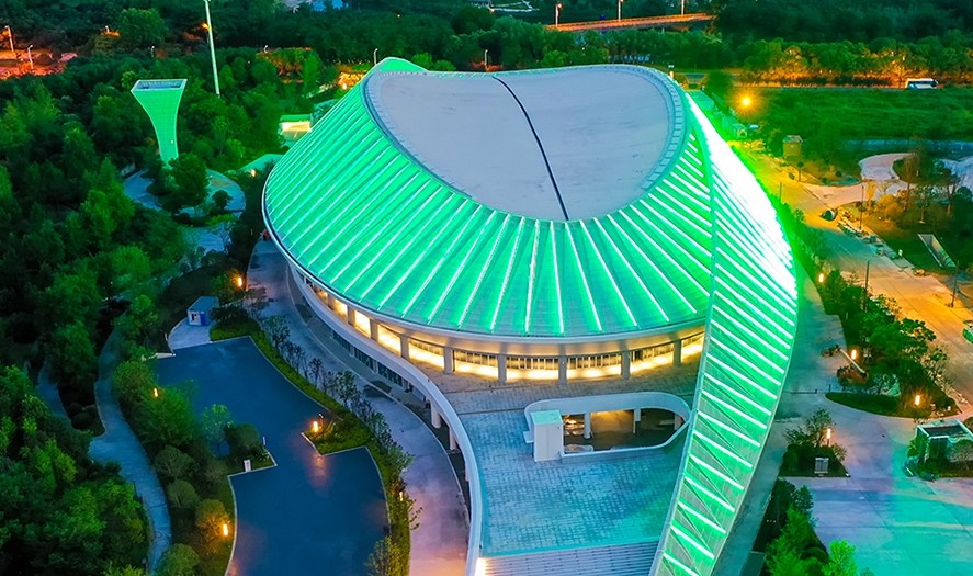 杭州奧體中心游泳館為亞運(yùn)會(huì)游泳、跳水、花樣游泳項(xiàng)目比賽場(chǎng)館及訓(xùn)練場(chǎng)館,位于杭州市蕭山區(qū),總建筑面積53959平方米,觀眾席位數(shù)約6000個(gè),是一個(gè)集游泳、跳水比賽和訓(xùn)練為一體的專(zhuān)業(yè)運(yùn)動(dòng)場(chǎng)館。場(chǎng)館擁有雙館合一的設(shè)計(jì)理念、獨(dú)特的流線造型,結(jié)合雙層全覆蓋銀白色金屬屋面,和兩翼張開(kāi)的平臺(tái)形式……作為世界上最大的兩館連接體非線性造型場(chǎng)館,無(wú)論白天夜晚,顏值都超高。