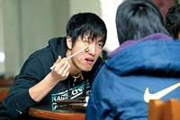 劉翔迅速返回公寓,套上帽衫,陽光很燦爛,劉翔很愜意,他“大搖大擺”、仰著頭,輕哼著流行歌走向食堂。“來了啊!”一走進二樓田徑隊的飯?zhí)茫⒓从袕N師倍兒親切地招呼他,劉翔笑著說“餓了”。跨欄組幾個人坐到東北角,這是他們的“老地方”。接著劉翔和大伙兒一起排隊,盛上青菜、棒骨、肉末燉粉條、炒雞蛋和白米飯,又拿了個柚子。