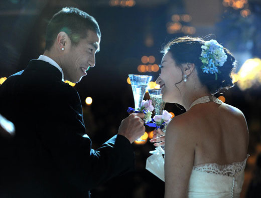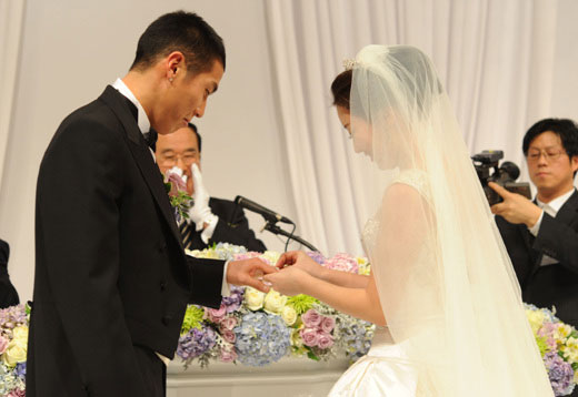 照片=韓聯社 2002年世界杯上的明星車斗理(左,德乙球隊TuS)于22日下午在首爾論峴洞皇宮飯店同申慧星(音,右)舉行了婚禮。申慧星是該酒店董事長申喆昊的長女。