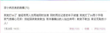 最近福建兩位記者因揭露“紫金礦業(yè)”,結(jié)果在同一天兩位記者的車(chē)子同時(shí)被撞。李小冉尤其關(guān)注這則新聞,她在昨日中午的微博中發(fā)飆:“天災(zāi)就夠叫人無(wú)奈的了,人禍也是沒(méi)完沒(méi)了。”她還 在微博中爆粗口,引來(lái)粉絲圍觀,認(rèn)為其有損形象。