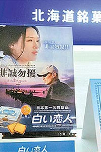 舒淇主演的《非誠勿擾》去年在中國創下驚人票房,帶動取景地日本北海道觀光人潮,旅游業者趁勢推出電影套裝行程,當地名產“白色戀人”餅干更把海報當免費宣傳,在當地隨處可見,連名古屋機場也看得到,可說是揚威日本。