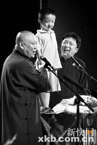 整場演出持續了近4個小時,全場笑聲、掌聲、喝彩聲不停,觀眾都說這次壓軸出演的老郭很“給力”。被要求返場后,郭德綱竟然把云字輩最小徒弟、于謙的兒子抱上桌子,用巧克力引誘他唱曲。結果小家伙上來就自選了一段《我是一個兵》,老郭又借著表示誰侵略我們就給打過去,還和小家伙合唱了一句太平歌詞。