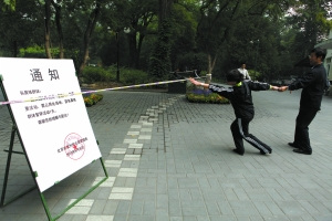 在公園門口和警戒線旁,均貼出落款為公園管理處的通知:“因公園9月25日有重要活動,需占用此場地,望各晨練群體暫停活動1天”,通知中的時間部分有被白紙粘貼的痕跡。