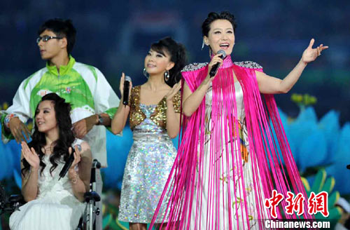 中新網12月13日電 與在海心沙舉辦的亞運會開幕式上強烈的視覺沖力和明星云集不同,12日晚在廣東奧林匹克體育中心上演的亞殘運會開幕式則充滿了溫暖和關愛。文藝表演環節中,除了400多位殘疾人媽媽團和300多個殘疾演員用手語帶領6萬名觀眾進行愛的表達震撼全場之外,一位特殊的明星創紀錄的三次出場給觀眾帶來了不同的驚喜和感動,她就是著名歌唱家、廣州亞運會宣傳大使——譚晶。