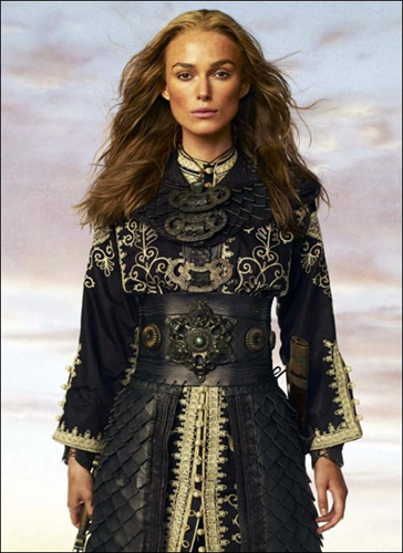 在2003年暑期檔奇幻大片《加勒比海盜》中,凱拉·奈特利與約翰尼·德普和奧蘭多·布魯姆搭檔,扮演一名外表大家閨秀實際野性難馴的總督女兒,令她獲“海盜公主”稱號,并從此星光大閃。2006年《加勒比海盜2:亡靈寶藏》和2007年《加勒比海盜3:世界的盡頭》2部最熱門暑期檔奇幻大片的熱映,更奠定了凱拉·奈特莉“古典美人”的地位。