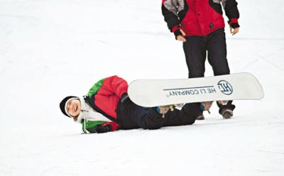 一向搞笑的張衛健故意在雪地跌倒,逗得張茜笑逐顏開。香港太陽報。