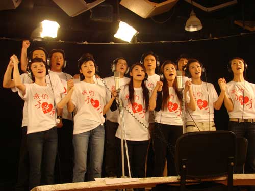 在將近10個小時的錄制過程中,所有參與的工作人員在將近五十度高溫的錄音棚內堅持工作,以最飽滿的熱情錄制歌曲。朱軍、董卿還都是在結束了白天的工作后在凌晨直接趕到錄音棚的,整個錄制過程到凌晨1點半才結束。大家都真心地希望通過這首歌曲能給災區人民帶去些許撫慰,能夠鼓勵大家攜起手來堅強面對,共渡難關。