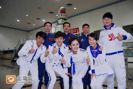 對于很多中國人來說,北京航天城的航天員訓練中心是一個神圣又神秘的地方。說它神圣,是因為讓我們倍感驕傲的神六、神七宇航員們都是從這里走向太空的;而說它神秘,自然是因為這個凝聚了我國航天事業者們心血與結晶的地方并不是每個人都有機會進到的。導演組經過多方的努力,終于爭取到了此次拍攝機會。拍攝當天,“快樂家族”的五位主持人還見到了翟志剛、景海鵬和劉伯明三位神七宇航員,親眼看到心目中的民族英雄,大家紛紛激動不已,一個勁地和他們握手、合影。