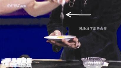 圖七,好了,這一動作做完后,劉謙用左手接過董卿的戒指把玩一番,并問董卿這枚戒指有多貴,這一過程,劉謙很自然地把戒指放到了右手,注意,是塞到了右手的食指和拇指中間,因為右手的食指和拇指中間已經捏著個被皮筋拉扯的掛鉤,塞進戒指后他用左手扭動著戒指,好像在做下意識的動作,其實,是把戒指環掛到那個掛鉤上,這一動作是在右手的食指和拇指“捏合”之中完成的,觀眾是看不到的,由于角度的原因,觀眾也看不到那根細細的皮筋。