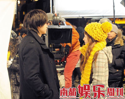 何潤東:跟她一起拍戲還蠻開心的,因為她真的是一個非常友善、非常棒的女孩子。吻戲的事情是這樣的,那天我朋友來探班,他帶了一些北京烤鴨來給我吃,我就一時忘記晚上我跟章子怡還要演吻戲,結果就吃了很多,然后蘸了很多蔥??后來想起,才發覺我怎么變成了一個最沒有演員道德的演員?那時滿嘴都臭得要命,現場的燈光師都聞到蔥的味道,更何況章子怡跟我要接吻呢。所以我也覺得特別不好意思,就找了一些味道很沖的魚干給她吃,這樣子我們兩個算是沒有誰對不起誰了。不過最苦的是旁邊工作人員,他們又要被魚干熏,又要被蔥熏,大家看這場戲以為是很浪漫唯美,其實它的背后是味道很難聞的。