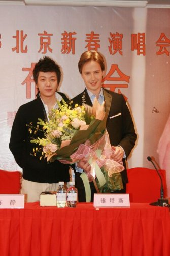 中新網(wǎng)1月24日電 “俄羅斯第一高音王子”Vitas今晚(1/24)將于北京首都體育館舉行“王者歸來(lái) Vitas新春演唱會(huì)”,昨天下午他于北京舉行記者會(huì)時(shí),曾以演唱Vitas代表作《Opera2》的超人氣“海豚音小王子”王櫟鑫特別到場(chǎng)與偶像相見歡,而Vitas的魅力讓總是活蹦亂跳的王櫟鑫突然害羞了起來(lái),卻還是忍不住用練習(xí)多時(shí)的俄語(yǔ)對(duì)他大呼“我愛你”!