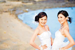 阿嬌(左)和拍檔阿Sa為法國婚紗拍攝的廣告,其市場及銷售經理鄭小姐表示阿嬌的代言人身份暫不會有變。