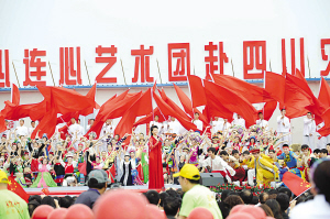 前天上午,為了讓更多的災區人民以及援建志愿者看到演出,“心連心”藝術團專門派出兩支小分隊赴德陽東汽新址以及北川擂鼓鎮舉行分會場表演,而昨天上午,主會場的演出則在綿竹上演,上萬觀眾觀看了演出。而央視著名主持人趙忠祥、畢福劍、徐俐、韓喬生、李瑞英、王小丫、鞠萍、馬東、朱迅等名嘴擔綱主持并反串了精彩節目。孫悅、韓磊、湯燦、張邁、陳小濤等近百位明星為災區群眾獻藝。這樣的陣容的確如之前報道的一樣,“超過春晚”。許多災區群眾感動地說:“央視心連心藝術團,在地震周年到災區演出,確實把溫暖送到了我們心里,讓我們對重建家園更有信心”。