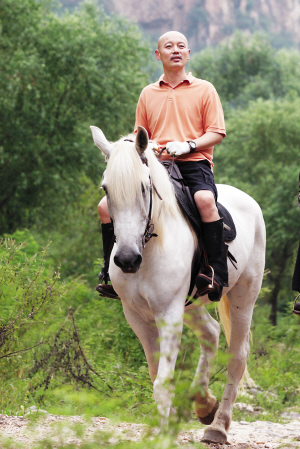 練騎馬是《讓子彈飛》演員的必修課。前段時間,廖凡、邵兵等人已經進組練習“馬戰”,現在終于輪到了葛大爺。葛優的打扮十分休閑,T恤短褲輕松上陣,只是腳下長長的馬靴暴露出他還是為騎馬做了一番準備的。上馬前,葛優還對工作人員開玩笑地說,他以前騎過馬,只是現在生疏了。盡管教練特地挑了一匹性格溫順的白馬,但剛騎上馬背的葛優還是顯得有些緊張。戴著白手套的雙手緊緊抓住韁繩,眼睛緊盯著地面,不敢抬頭。但很快,葛優在一名助手、兩名教練的前后護衛下逐漸放開膽子,催馬慢跑起來,隨著馬跑的節奏晃動身體,還有閑情抬頭看看山景,臉上也多了笑容,看來很快葛大爺就能在馬上跟姜文一決雌雄了。