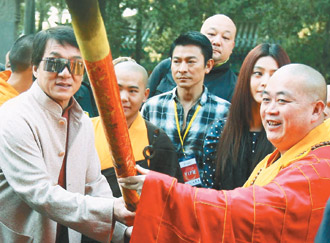 中新網10月23日電 劉德華將在新片《新少林寺》中拜成龍為師學功夫!昨天河南少林寺的寧靜被打破,宣揚武術精神的《新少林寺》開鏡,成龍、劉德華、謝霆鋒、范冰冰、吳京齊聚少林寺,現場貴賓、武校學生見到巨星全變粉絲,拚命圍上前來,場面一度失控,成龍則發揮大哥本色指揮現場,呼吁大家維持秩序。