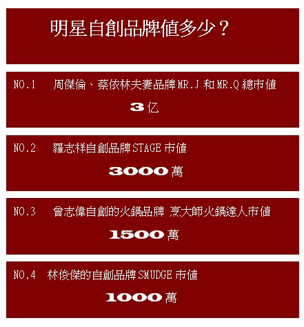 而針對這種明星以自己名義創(chuàng)立品牌的現(xiàn)象,究竟明星們的品牌價值值多少?為此記者特意采訪了知名品牌管理學(xué)者的楊教授,據(jù)楊教授解釋:由于藝人本身具有較高的社會知名度和形象的度,因此藝人創(chuàng)意品牌的價值起點都會比普通人高出好幾倍,因此藝人的知名度和形象度與其創(chuàng)立的品牌價值是密切相關(guān),從某種意義上成正比關(guān)系,而對娛樂圈的一些藝人及其自創(chuàng)品牌,楊教授也給出一個系統(tǒng)的市值評估,如羅志祥的自創(chuàng)品牌STAGE市值 3000萬,林俊杰的自創(chuàng)品牌SMUDGE市值1000萬,曾志偉自創(chuàng)的火鍋品牌烹大師火鍋達(dá)人市值1500萬,而周杰倫與蔡依林這次合伙經(jīng)營的MR.J和MR.Q市值,楊教授也給出了一個值得參考的數(shù)據(jù)3億。