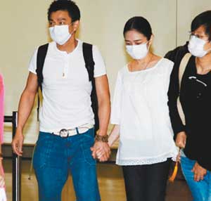 晚10時半左右,劉、朱飛抵香港,上百媒體及fans“急撲”機(jī)場一探究竟。當(dāng)閘口打開,遭媒體圍攻的華仔不愿松開朱麗倩的手并一起步出機(jī)場,為保護(hù)朱麗倩不被人群撞倒,華仔更騰出另一只手摟著朱麗倩,二人寸步不離,非常恩愛。接著,華仔與朱麗倩在幾名保安及警員保護(hù)下匆匆離開,不過由于場面極度混亂,其間不時有人跌倒及出現(xiàn)掉鞋子的狀況。