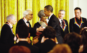 肯尼迪中心榮譽獎是美國為表彰演藝界杰出人士而設置的終身成就大獎。在本屆頒獎典禮上,美國總統(tǒng)奧巴馬6日攜夫人米歇爾親自到場慶賀。對于五位獲獎藝人,奧巴馬在致詞中表示:“這些藝術家確實是最棒的。他們是現(xiàn)世的提醒者,時刻告訴我們這一事實——在這里,我準備借用米歇爾的一句臺詞——這些藝術并不只是我們國民生活的一部分,它們是我們國民生活的核心。”