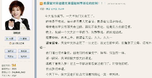 25日,謝晉遺孀狀告宋祖德等人誹謗案勝訴后,劉曉慶在博客上表示這場官司的輸贏在自己的預料之中,“他們應該輸。不然就沒有天理了。”劉曉慶還感謝全世界各界人士及網民對謝晉導演的支持,感謝法律公正,還謝晉導演清白,也還了自己的清白。